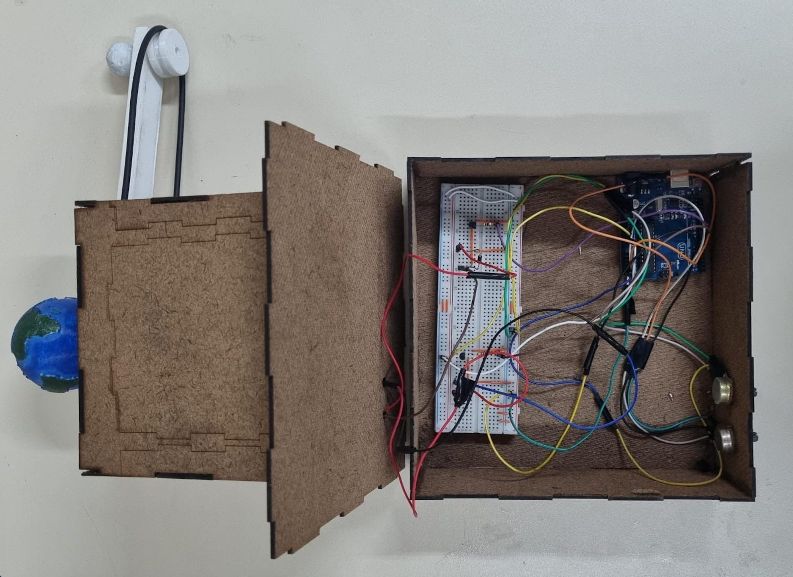 Modelo dinâmico do sistema Terra-Lua controlado por Arduino Uno. O sistema utiliza um conjunto de engrenagens e motores para simular os movimentos de rotação e translação lunar, permitindo a visualização do movimento síncrono da Lua em torno da Terra.